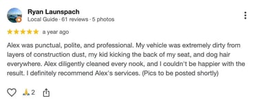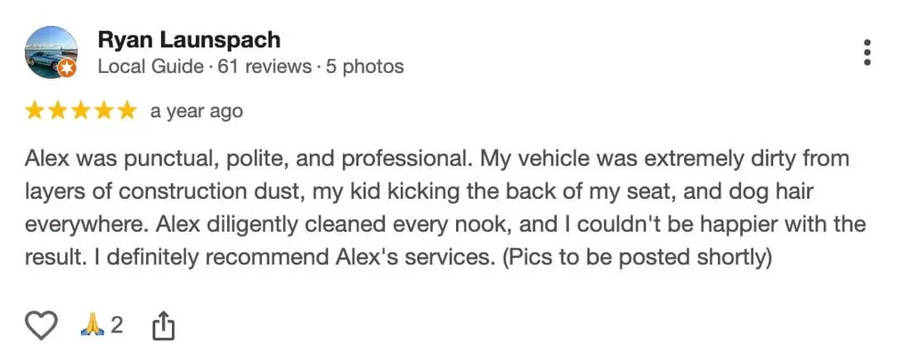 Most detailing appointments take approximately 1.5–2 hours, depending on the vehicle’s condition and the service package selected.